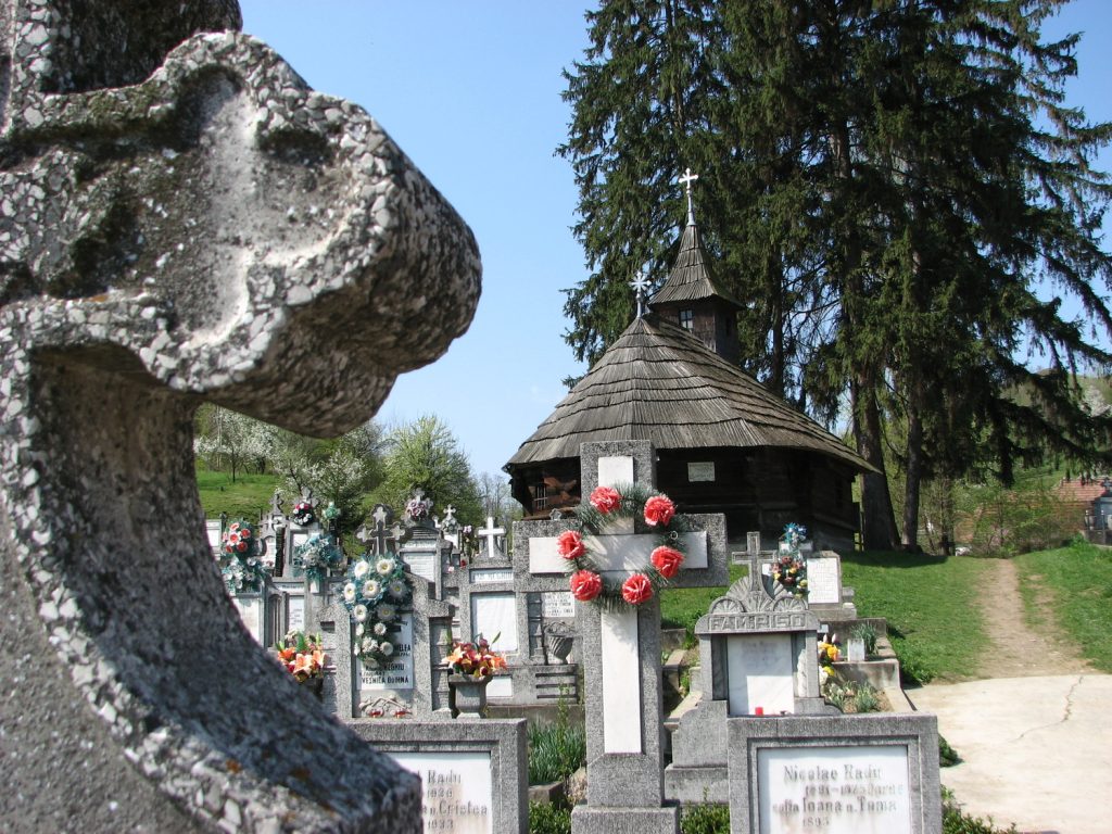 N-o vezi din drum şi nici măcar clopotniţa nu i-o zăreşti. Ai de urcat prin cimitirul satului până să ajungi la ea, dar, credeți-ne, merită din plin. Scurta plimbare, de nici cinci minute printre crucile vechi, pe poteca de piatră, te rupe de lume şi te cucereşte cu aerul ei molcom, de poveste bătrânească. Curând vei vedea şi bisericuţa, cocoţată pe dealul cimitirului. Şi e atât de măruntă, încât pare în miniatură. Dar asta n-o face mai puţin valoroasă, ba chiar o aşează la loc de cinste între monumentele de artă cu totul ieşite din comun, cel puţin în judeţul nostru.